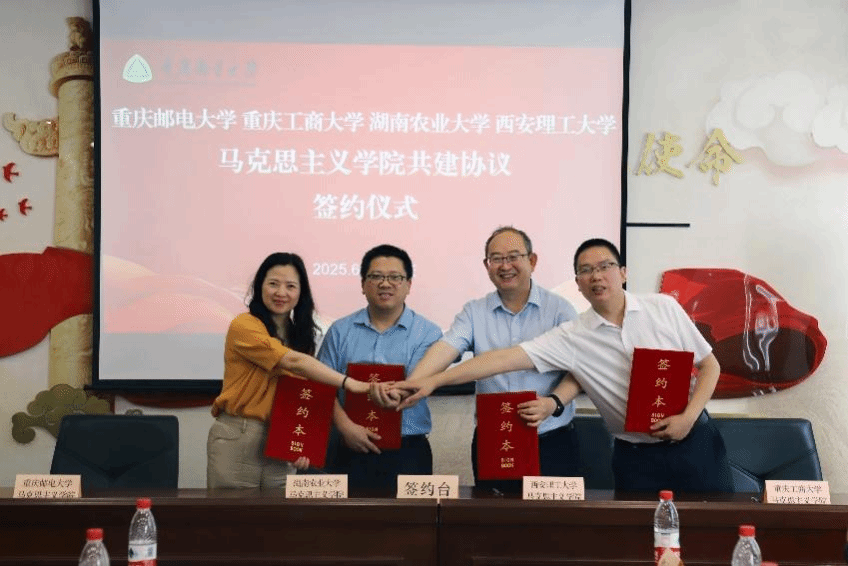 2025年6月13日下午,重庆邮电大学、太阳成集团tyc122cc、湖南农业大学、西安理工大学122cc太阳集成游戏共建签约仪式在重庆邮电大学122cc太阳集成游戏107会议室举行。三地四校122cc太阳集成游戏负责人及骨干教师代表齐聚一堂,围绕马克思主义理论学科建设、思政课改革创新等议题共商合作蓝图。