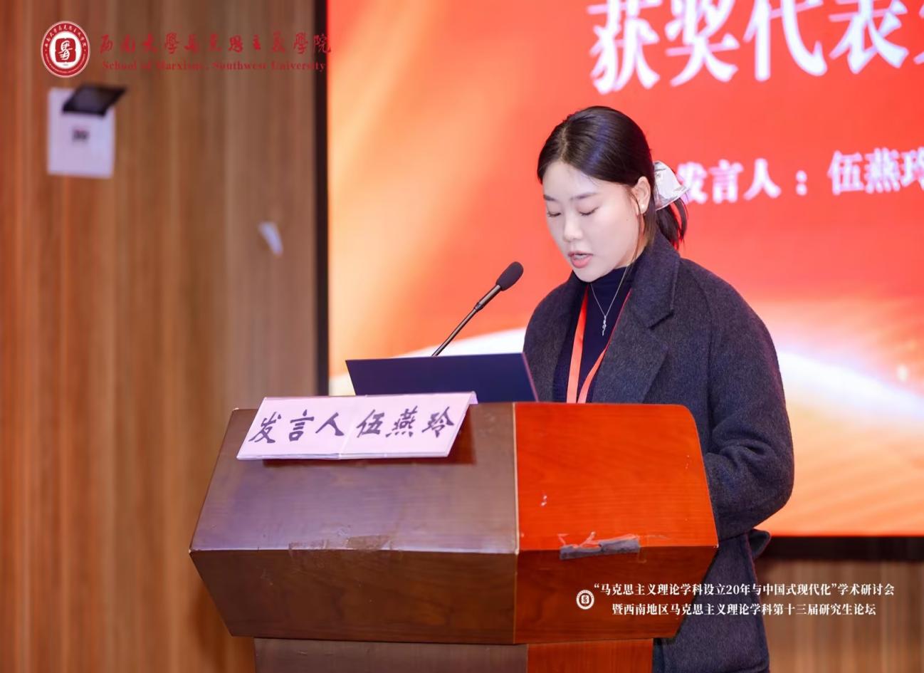 我院2024级思想政治专业学生伍燕玲的学术论文在本次论坛中成功入选论文集,并获邀出席此次学术盛会。在论坛闭幕式上,伍燕玲作为获奖代表受邀发言,结合论文内容与研究成果同与会专家学者进行交流,其精彩表现赢得了现场专家学者的广泛好评。