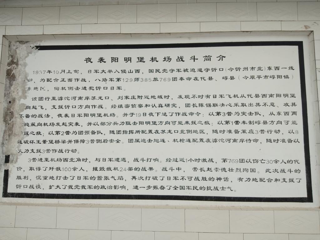 1937年10月19日夜,八路军129师第769团在当地人民群众的协助下,隐蔽地进入代县南阳明堡飞机场,突然发起进攻,经过1小时激战,歼灭日军100余人,击毁击伤飞机24架,有力地配合了正面战场作战。