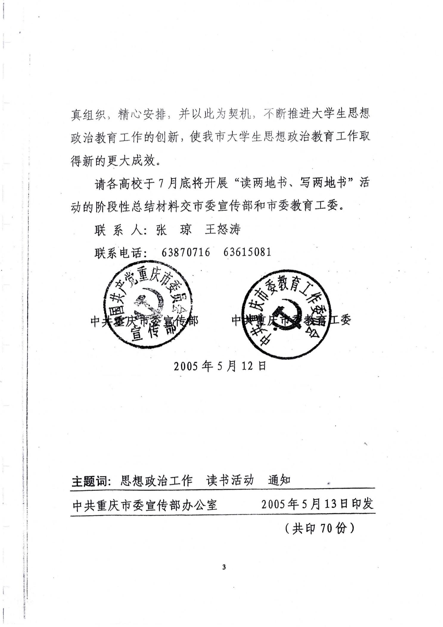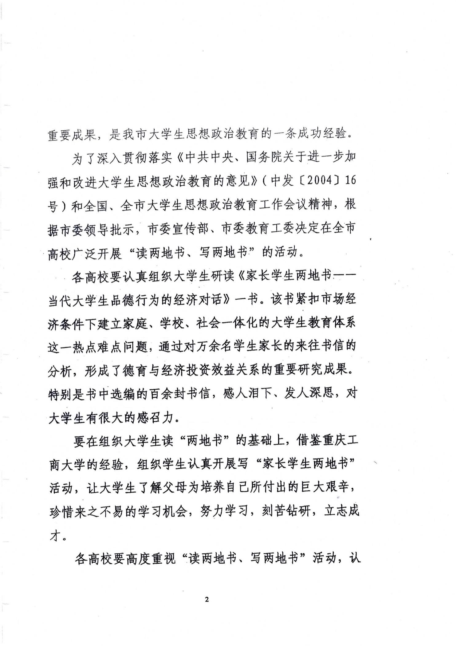 中共重庆市委宣传部、中共重庆市教育工委:关于在全市高校开展“读两地书、写两地书”活动的通知