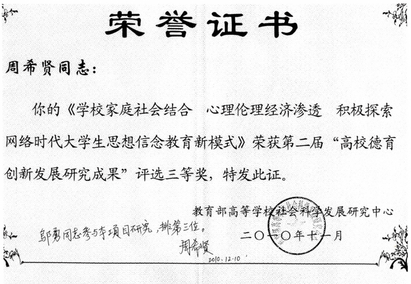 教育部:高校德育创新发展研究成果奖三等奖