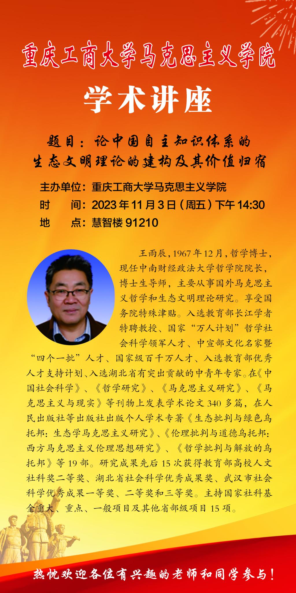 主讲人简介:王雨辰,1967年12月,哲学博士,现任中南财经政法大学哲学院院长,博士生导师,主要从事国外马克思主义哲学和生态文明理论研究。享受国务院特殊津贴。入选教育部长江学者特聘教授、国家“万人计划”哲学社会科学领军人才、中宣部文化名家暨“四个一批”人才、国家级百千万人才、入选教育部优秀人才支持计划、入选湖北省有突出贡献的中青年专家。在《中国社会科学》、《哲学研究》、《马克思主义研究》、《马克思主义与现实》等刊物上发表学术论文340多篇,在人民出版社等出版社出版个人学术专著《生态批判与绿色乌托邦:生态学马克思主义研究》、《伦理批判与道德乌托邦:西方马克思主义伦理思想研究》、《哲学批判与解放的乌托邦》等19部。研究成果先后15次获得教育部高校人文社科奖二等奖、湖北省社会科学优秀成果奖、武汉市社会科学优秀成果一等奖、二等奖和三等奖。主持国家社科基金重大、重点、一般项目及其他省部级项目15项。