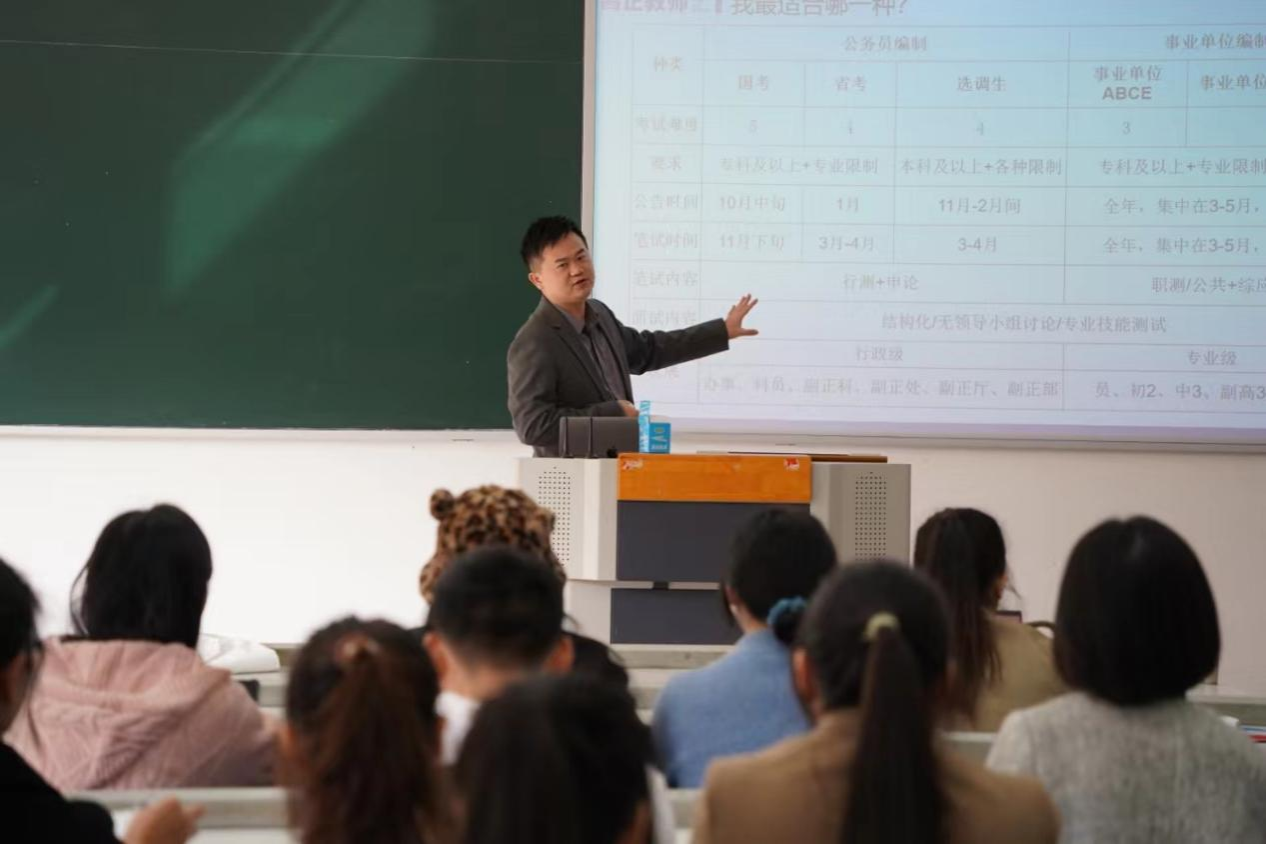 夏老师向同学们全面细致地讲解了教师职业的国家政策、发展前景,各类教师岗位的报考条件、考试类型、考试难度、考试时间、福利待遇,教师资格证如何考取,以及如何选择适合自己的岗位并为其做准备,并希望同学们结合自身实际情况,做出最优选择。夏老师还向同学们讲授了考取教师资格证、教师岗位及其他就业岗位所遇到的面试类型、内容和如何准备面试,指出了同学们在面试过程中容易犯的部分错误,传授了同学们在面试过程中一些常用的技巧。夏老师还向同学们分享了往届学生备考过程中所踩过的“坑”以及“上岸心得”,他认为个人职业发展不仅需要切实有效的规划,还需要切切实实前的行动,因此他建议同学们做一个行动计划表,规定好自己在各个阶段的目标,对标对表严格执行,这样一定能在就业时有所收获。