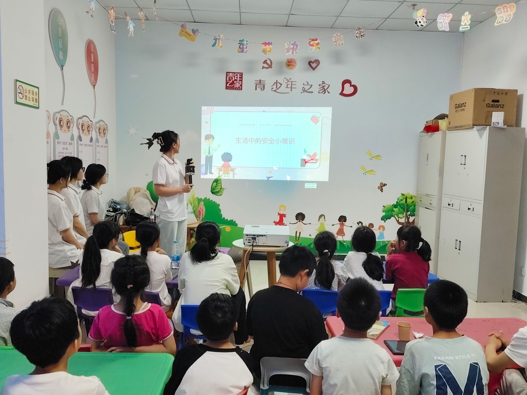 (图为团队成员为社区留守儿童进行消防安全知识科普)