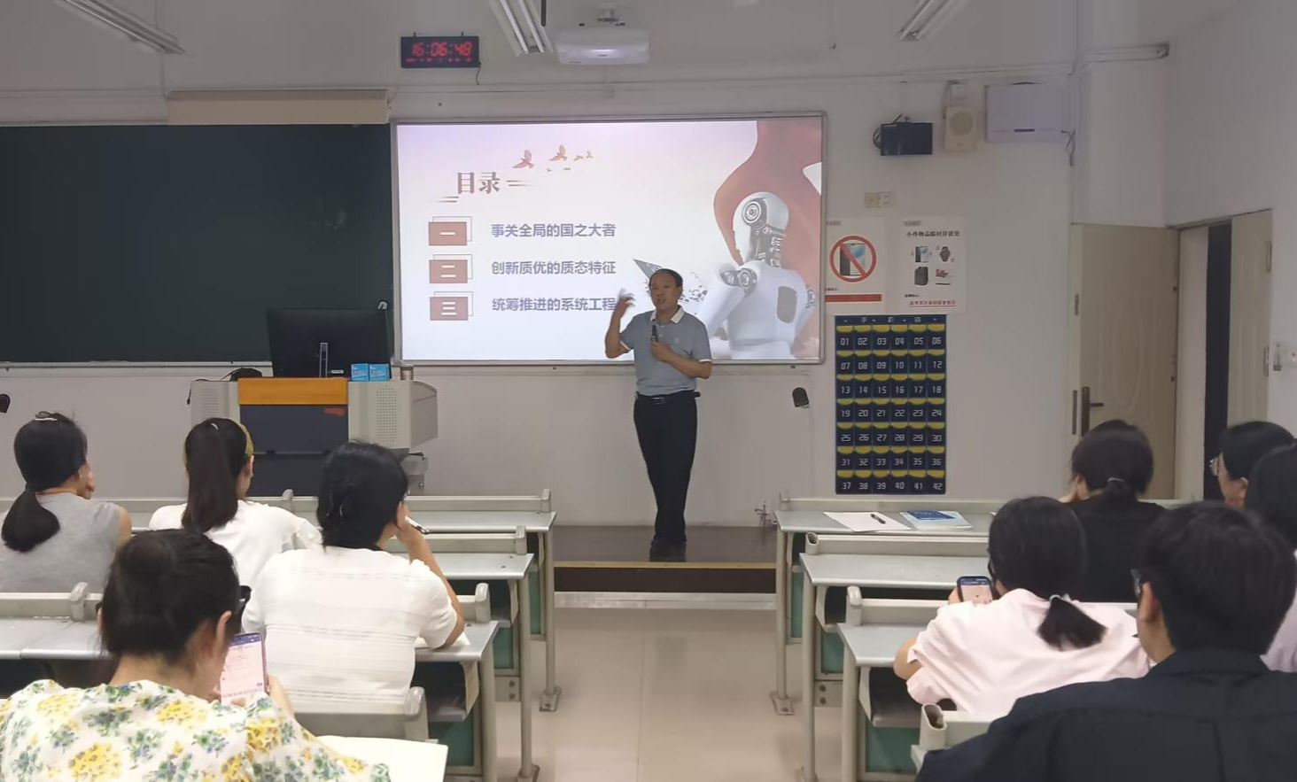 2024-2025学年第1学期形势与政策课程第三专题集体备课会于2024年9月12日下午在慧智楼90225教室举行,来自于122cc太阳集成游戏、金融学院、经济学院等18个学院的专兼职教师参加了会议。备课会由形势与政策教研部专任教师黄伟教授主讲。